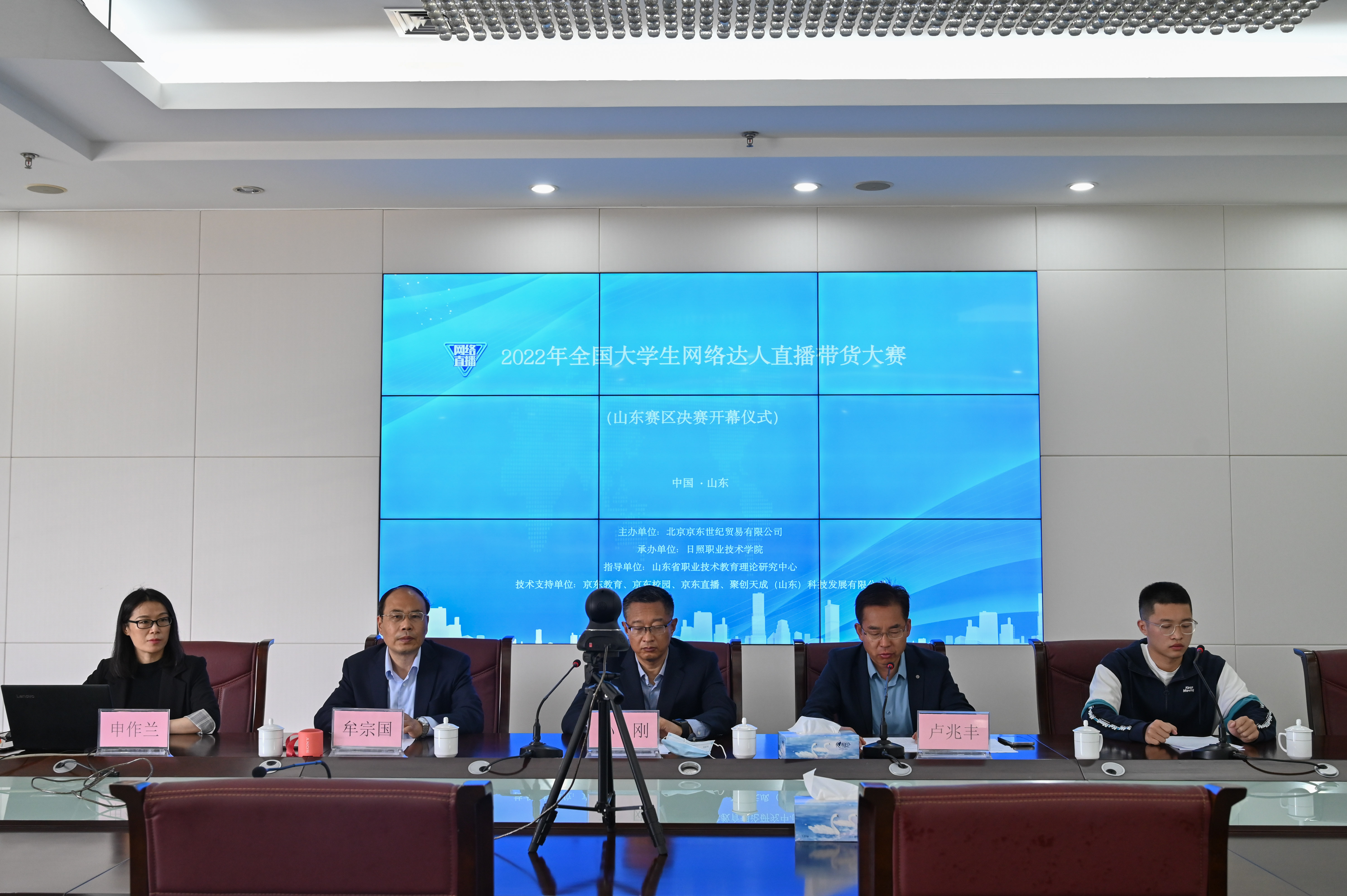 5月6日,全国大学生网络达人直播带货大赛山东省决赛在我校成功举办。京东教育研究院院长庞青,学校党委委员、副院长孙刚,商学系党总支书记牟宗国,商学系副主任申作兰,裁判组全体成员,所有参赛队伍指导老师及学生参加开幕式。开幕式由教务处处长卢兆丰主持。