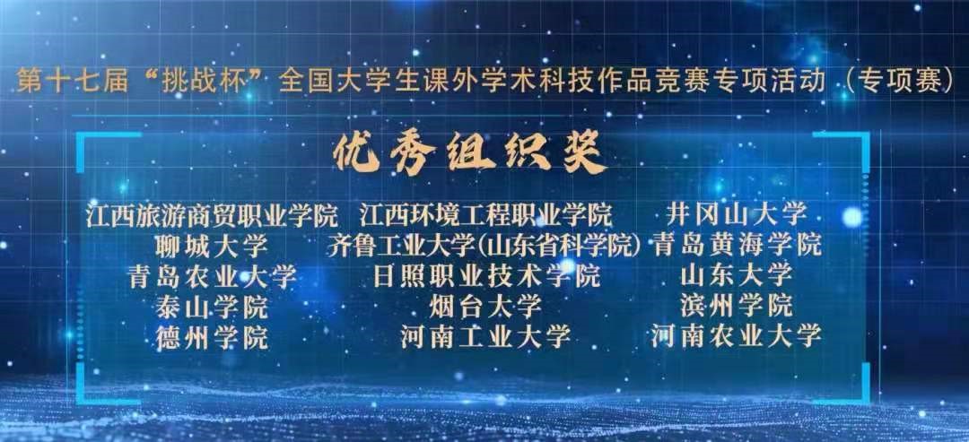 4月12日,由共青团中央、中国科协、教育部、中国社科院、全国学联和四川省人民政府共同主办的第十七届“挑战杯”全国大学生课外学术科技作品竞赛在四川大学落下帷幕,学校在竞赛专项赛组织工作中,获评全国优秀组织奖,为山东省获此殊荣的唯一一所高职院校。