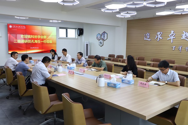 6月16日下午,山东省科协学会部二级调研员孔海生、日照市科协党组成员副主席解植国、日照市科协学会部部长王俊一行到我校调研,了解我校科协工作开展情况。调研座谈会在天润楼801会议室召开,学校党委副书记、日照职业技术学院科协主席牟善德主持会议。院长助理、日照职业技术学院科协副主席李洪叶,科研与产教处处长徐原、副处长张雪飞,山东省海洋甲壳类资源综合利用工程技术研究中心主任周庆新以及学校科协工作人员参加座谈。