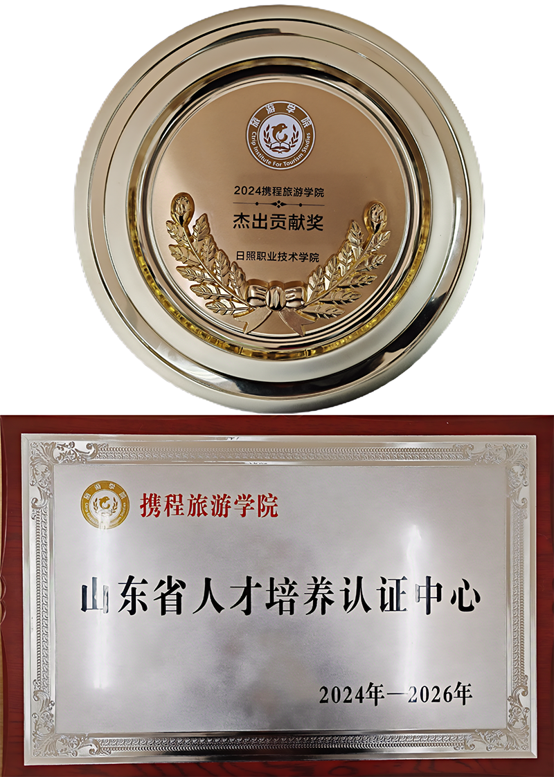 会上,携程旅游学院对2024年校企合作取得的各项成果进行了表彰,并举行了颁奖仪式。我校因在开展携程“1+X”定制旅行管家培训方面表现优异,被授予“2024携程旅游学院杰出贡献奖”,并获批“携程旅游学院2024-2026年山东省人才培养认证中心”。