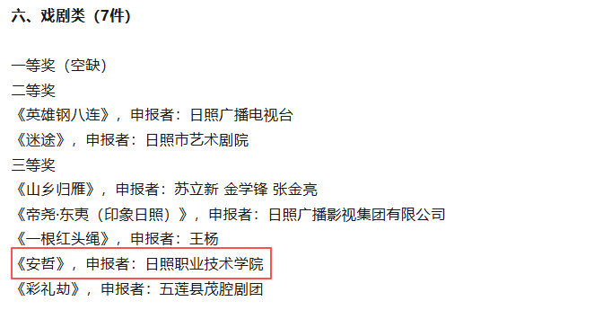 此次获奖的作品题材多元,涵盖戏剧类、电视类、文艺理论和评论类领域,充分展现了我校这几年在文化艺术领域精品创作的成果和工作成效。其中,《安哲》是由我校师生共同创作的原创话剧,通过舞台艺术再现了其坚定的理想信念与奋斗精神,激发观众的爱党、爱国、爱社会主义的深厚感情。《东虾入疆记》依托学校师生团队“东虾西移”援疆项目背后的山海情,以独特的视角和拍摄手法让日照援疆更加的具象化,短片还为山东卫视、山东教育卫视、日照电视台提供了真实案例支撑。《成长的蜕变》通过技能学子敢想敢做、坚持与韧劲、乐观与善良的有故事的内心表达,书写了职教学生成长成才的事迹,反映了高职教育人人出彩、人人皆可成才的大好环境。《跨文化视角下的中国书法欣赏与教学实践》探讨了跨文化视角下的中国书法教学实践、跨文化视角下中国书法的创新发展,既立足本土文化根基,又具备国际学术对话的深度,能够更好得融通中西的文化学术交流。