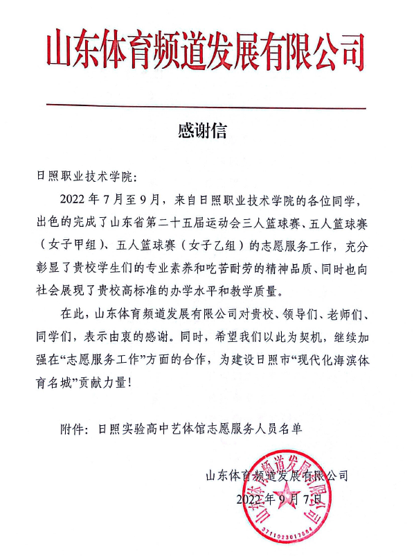 近日,我校收到了一封来自山东体育频道发展有限公司的感谢信,信中对我校学生主动投身山东省第二十五届运动会篮球赛期间所做的工作表示高度认可和赞扬。