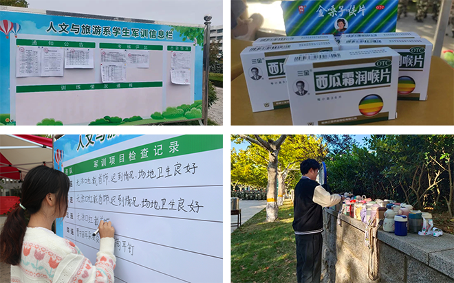 提前谋划,全面保障。在军训工作开展之前,人文与旅游系班子成员组织全体参训辅导员、班主任召开军训专题调度会,对军训工作部署进行强调,统一筹划,着手细节,切实从思想上引起全体师生对军训的高度重视;组织成立了军训工作小组,制定军训先进评选标准,营造争优创先的积极氛围,为军训工作顺利开展打下基础。除了安排系班子成员、新生班主任和学生助理每天到军训场地值班外,还安排了辅导员、专业教师在现场排班轮岗,促进老师们和新生尽快熟悉,及时解决新生在军训过程中的各种问题,保障训练活动有序开展。我系还为承训教官购买了润喉药物、扩音器,为学生准备姜汤水和药品,为值班教师和学生配备防寒服,为各连队配备手机贴和手机收纳箱,保证新生专心训练,确保军训秩序及财产安全。