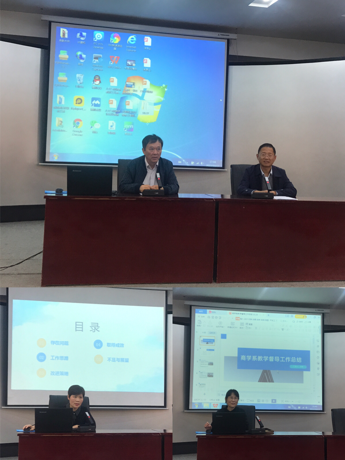 商学系副主任刘梅主要从教学督导工作的重要意义、制度化、规范化、科学设置教学督导评分标准、教学督导工作实施等七个方面作了教学督导工作总结。商学系把督导工作作为商学系日常管理工作的重要内容,一把手定期调度,分管领导认真落实。每周一小总结,每个月一大总结,随时掌握教师的教和学生的学,提高信息化手段的使用,将督导工作落到实处。