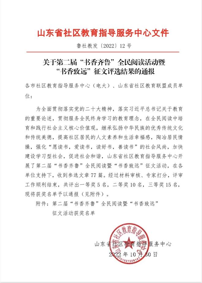 近日,由山东省社区教育指导服务中心组织开展的第二届“书香齐鲁”全民阅读暨“书香致远”征文比赛发布评选结果,由日照市社区教育指导服务中心推荐的作品荣获一等奖2名,二等奖3名,三等奖4名,获奖名次和数量均列全省第一。