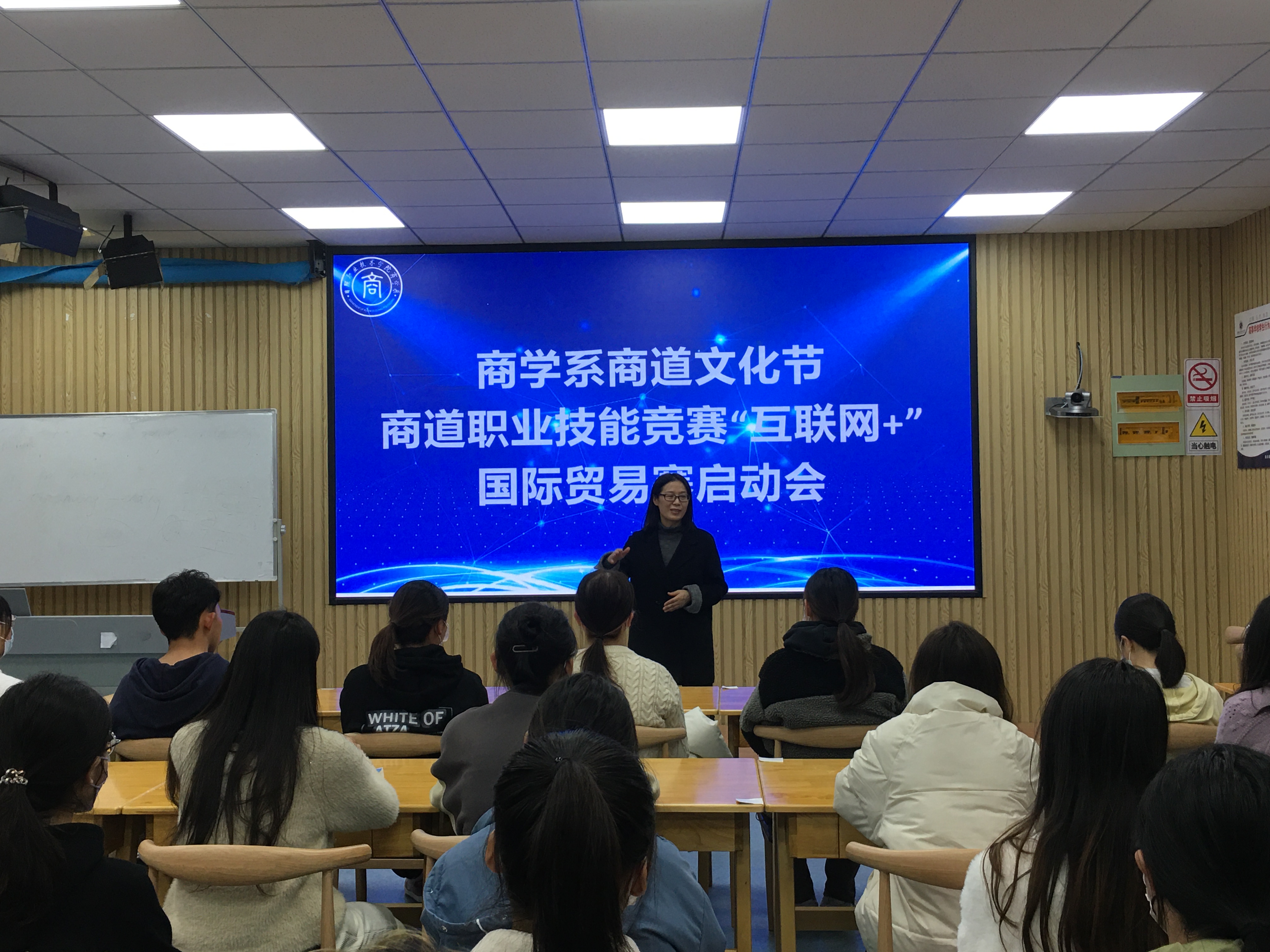 11月17日,商学系商道文化节——商道职业技能竞赛“互联网+”国际贸易综合技能赛项启动会在格物楼3D虚拟情境多功能教学中心顺利举行,商学系副主任申作兰和国际经济与贸易专业师生参加活动。