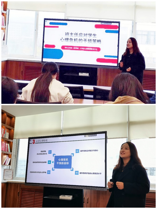 为进一步提升会计系班主任老师处理突发事件的能力,预防校园心理危机事件发生,促进学生健康成长,11月22日下午,会计系在海润楼N417开展“班主任应对学生心理危机的干预策略”专题培训,会计系各专业年级的班主任参加培训。培训由心理指导中心周末老师主讲。