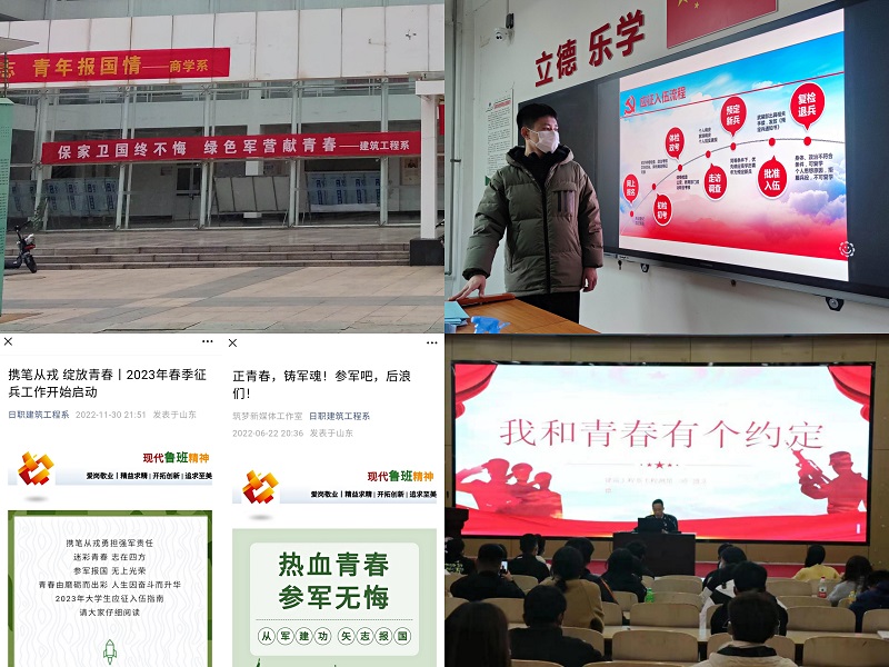 通过组织班级主题班团会,向同学们详细地了解大学生参军入伍的应征条件、应征流程、优惠政策、发展途径以及退役士兵的复学、就业安置等问题;宣讲会邀请了三位优秀退役士兵,他们依次讲述了充满艰辛而又丰富多彩的军旅生活,以自身经历激发了广大青年参军报国的热情;此外,建筑工程系还通过悬挂宣传标语、利用微信公众平台等新媒体手段,营造了浓厚的参军入伍氛围。