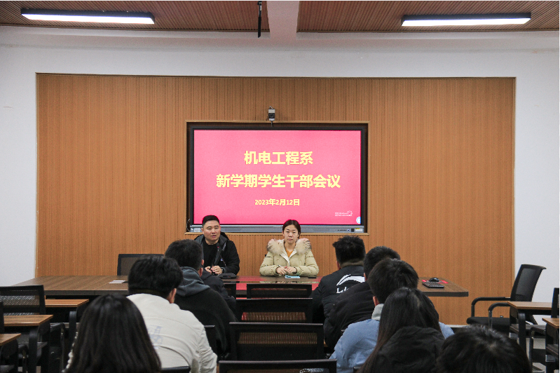 为切实加强学生干部队伍素质,提升队伍凝聚力、向心力,推进系部学生工作平稳有序开展,2月12日下午,机电工程系在山润楼423会议室召开全体学生干部工作会议,会议由团总支书记张西进主持,全体学生干部参加会议。