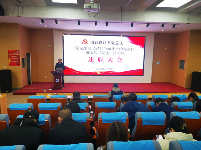 3月2日下午,创意设计系在地滋楼A区报告厅召开2022年度党支部书记履行全面从严治党责任和抓基层党建工作述职评议会。创意设计系党总支班子成员、各支部委员及全体党员参会,系主任张永宾主持会议。