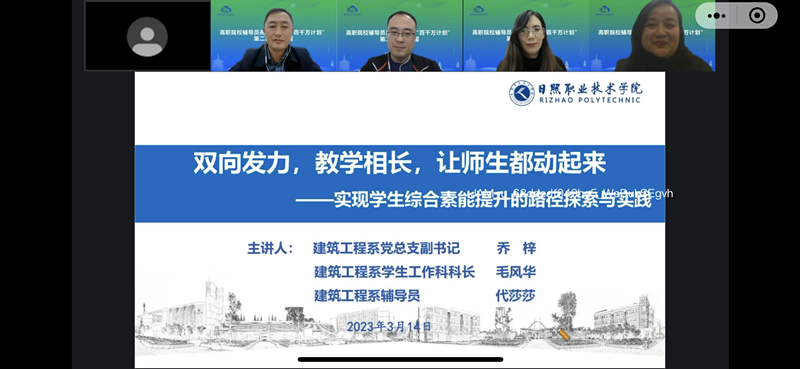 为做好本次讲授活动,学生工作处高度重视、周密部署,建筑工程系组建课程团队精心准备。团队成员通力合作、密切配合、积极商讨,经过数次线上线下研讨,以《双向发力、教学相长,让师生都动起来——学生综合素质提升的路径探索与实践》为主题,高质量完成课程并精彩呈现。
