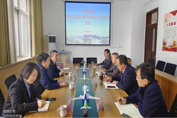 牟盛勇对客人的来访表示欢迎,并介绍了学校和院系的基本情况。隋立国介绍了潍坊工程职业技术学院航空工程学院的基本情况及来访目的。随后双方就航空专业的人才培养、专业建设、校企合作、技能大赛、实训室建设等方面进行了深入探讨与交流。