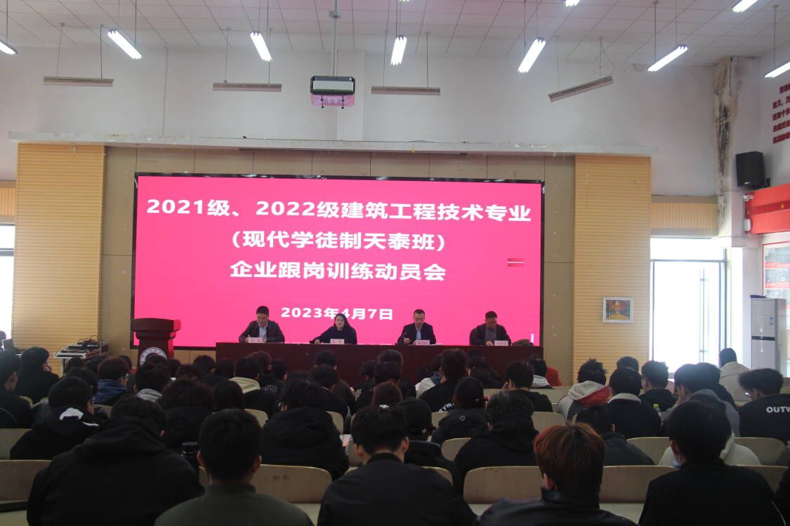 4月7日上午,建筑工程系2021级和2022级建筑工程技术专业(现代学徒制天泰班)企业跟岗训练动员大会在海润楼二楼报告厅召开。日照天泰建筑安装工程有限公司行政中心主任石伟、工程中心主任王斌、行政中心人资部人事主管郑玉梅、直属分公司工程科科长王培瑞,建筑工程系建筑工程技术专业教研室主任许崇华、学生实习管理负责教师姜长磊以及班主任冯伟、朱波和2021级2022级“天泰班”的学生参加动员大会。会议由建筑工程系副主任杨志刚主持。