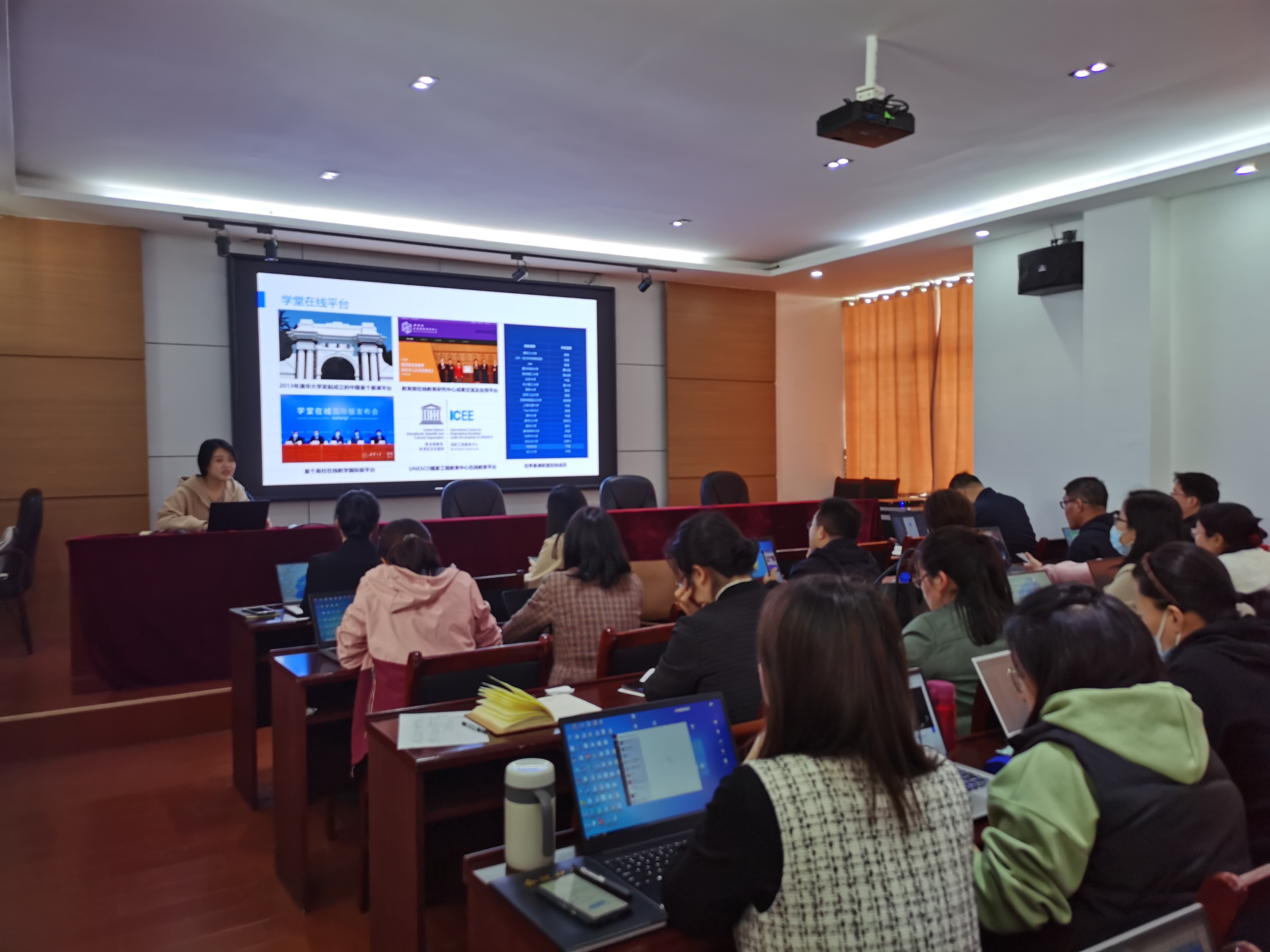 申作兰强调了信息化教学的重要性,希望老师们能认真学习,当堂建课,现场实操,切实提高课堂信息化应用水平。清华大学学堂在线项目经理祝敏介绍了学堂在线平台的发展及取得的成就,然后演示了雨课堂的基本功能,如弹幕投稿点名、限时答题、音视频直播等教学互动新模式,随后指导老师们现场建课,逐步讲解,并随时解答老师们遇到的各种问题。