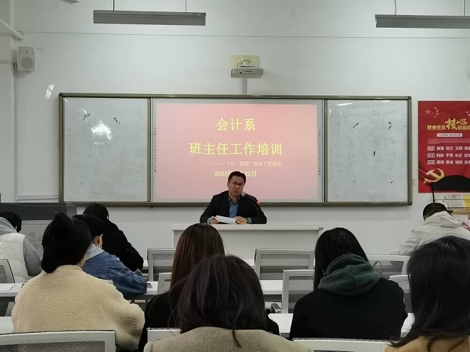 根据学校五一假期安全工作要求,为做好会计系五一期间学生安全教育工作,4月23日,会计系在海润楼S404开展班主任工作培训,强调假期安全教育工作。会计系党总支书记訾波、副书记朱华东、辅导员和全体班主任参加了会议。会议由朱华东主持。