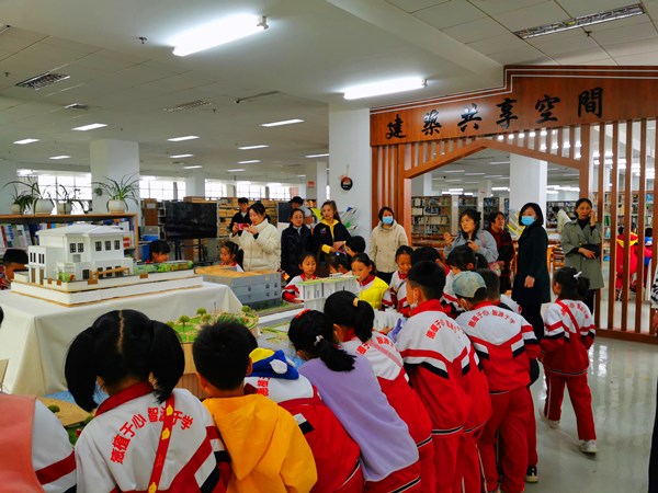 参观伊始,图书馆老师向小读者们介绍了馆藏布局和资源分布等图书馆概况。随后,在老师的引导下,小读者们由图书馆大厅的展区开始参观,首先来到行知书苑,小读者们对少儿阅读机产生了极大的兴趣,纷纷参与体验,紧接着老师带领小读者们来到人文素养共享空间、建筑共享空间、海洋共享空间等进行参观。在参观的过程中,小读者们安静排队、认真听讲、有序参观,兴致勃勃地提出了许多有趣的问题:“老师,这个建筑模型是学生做的吗?”“老师,图书馆有历史的书吗,我能借吗?”面对小读者充满好奇又认真的提问,图书馆老师和蔼地为之一一解答,并与他们进行耐心细致的交流。