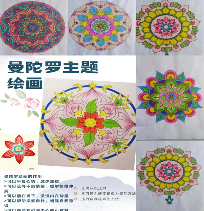 活动开始,同学们集体观看线上曼陀罗绘画心理疗法课程,主讲老师从曼陀罗绘画理论学习入手,讲解了曼陀罗绘画疗法的概念,曼陀罗在自我成长、咨询和团体中的运用等,帮助学生了解通过曼陀罗绘画能够激发出绘画者的自性原型,从而获得治疗的作用。接着,同学们自由创作,在绘画过程中,伴随着缓和的音乐,同学们沉浸在自己的内心世界里,慢慢地将属于自己的曼陀罗画面变得越来越丰富、和谐。