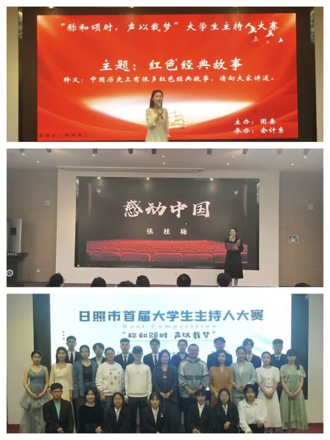 为更好地推进大学生全面发展,营造积极向上的校园文化氛围,提高学生语言表达能力,培养“坐下来会写,站起来能说”的新时代青年,用艺术形式展现青年风采、陶冶情操,凝聚奋进新时代、践行新担当、展现新作为的磅礴力量,5月9日下午,由团委主办、会计系承办的日照市首届“称和颂时,声以载梦”大学生主持人大赛决赛在地滋楼A二楼报告厅举办。日照广播电视台主播冰清、占山、飞杨,建筑工程系李宛臻、创意设计系李沣霖、会计系葛夫云担任本次大赛的评委老师。