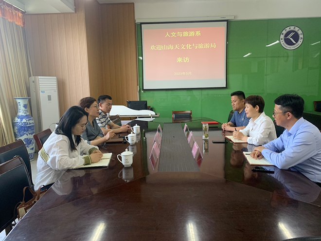 5月23日,山海天文化和旅游局局长李苇、副局长刘文一行3人来我校访问交流,人文与旅游系副主任李凌、秦志玉及教师代表参加座谈。