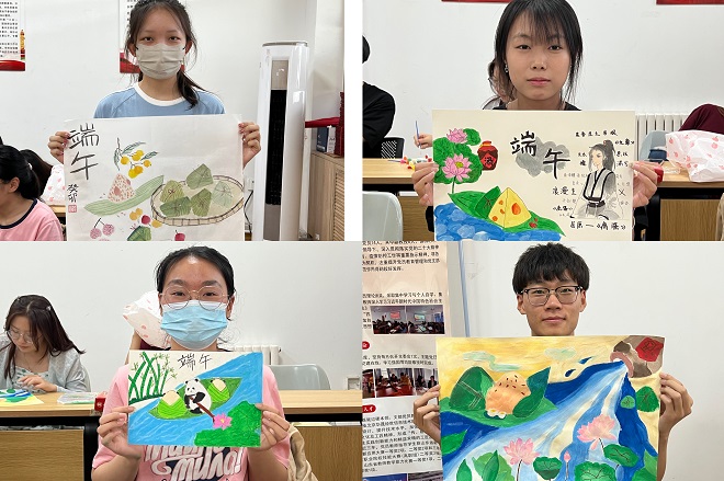 活动包括三部分内容。“巧制香囊,端午安康”手工香囊制作活动中,同学们以小组为单位,了解香囊制作方法,选香囊,填香料,挂流苏,讨论做法交流心得,热闹非凡。一个个玲珑可爱、寓意吉祥的端午香囊在手中诞生,清香四溢,沁人心脾。看着自己亲手制作的香囊,大家脸上都洋溢着笑容,不约而同的举起来展示,很有成就感。这不仅增强同学们的动手能力,更引导同学深刻感受中国传统节日和传统文化。“五彩纳福,温情端午”五彩线制作活动中,同学们拿到原材料后开始细心编织,熟练的同学们更是开始帮助大家,进行现场教学,不多久便完成了一条条精美的五彩线手绳。同学们将祝福和美好期望寄托其中,戴上了亲手制作的象征着平安、吉祥的五彩绳,活动现场充满了欢声笑语。“浓情端午粽飘香”绘画活动中,同学们在活动中发挥自己的创意和想象力,用画笔描绘出自己心中的端午节景象。他们画出了大眼睛的可爱粽子、激流中向前的龙舟等图案,展现了端午节的独特传统文化。同学们用画笔描摹出端午时节的丰富多彩,用美好的祝愿表达出对生活的无限期许。