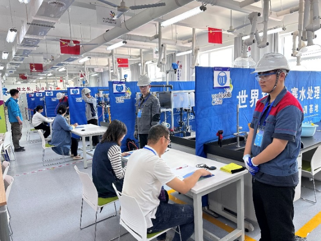 水处理技术赛项是对城市或工业供水和废水处理系统进行管理、监控和维护的竞赛项目。本次比赛包括实验室条件下水样混凝优化实验、水样中铜离子含量的测定、泵站的运行和维护、过程自动化系统 PA、VR 仿真5个模块。涉及水质分析检验、水处理药剂的选用、电气自动化、化工管路和机械设备的拆装、运行与维护以及水处理仿真等多学科知识与技能,对参赛选手综合素质提出了很高的要求。