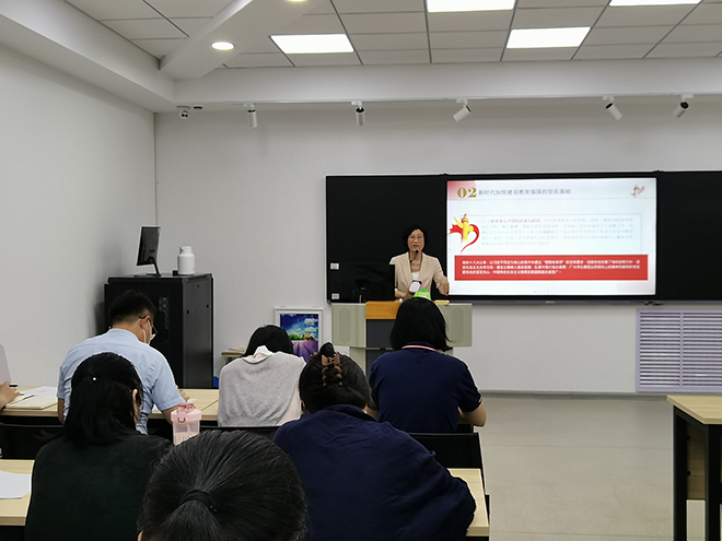 李侠从三个方面进行讲授。她首先阐明了新时代加快建设教育强国的重大战略意义,指出全面建设社会主义现代化国家,教育是根本,我们要充分认识深入实施科教兴国战略、人才强国战略、创新驱动发展战略,坚持教育优先发展、科技自立自强、人才引领驱动,加快建设教育强国、科技强国、人才强国的重要意义。接着,她结合实例讲授了新时代加快建设教育强国的坚实基础,概括了党的十八大以来教育事业取得的伟大成就。最后她结合习近平总书记在党的二十大报告中关于教育强国的重要论述,阐明了新时代加快建设教育强国的总体方向和重点任务。她要求全体党员教师要扛起为党育人、为国育才的崇高使命,贯彻党的教育方针,全面提高人才培养质量;贯彻新发展理念,不断深化教育教学改革,推进教育数字化建设,不断提高信息化素养;加强师德师风建设,坚定理想信念、陶冶道德情操、涵养扎实学识、勤修仁爱之心,树立“躬耕教坛、强国有我”的志向和抱负,坚守三尺讲台,潜心教书育人,着力培养担当民族复兴大任的时代新人。