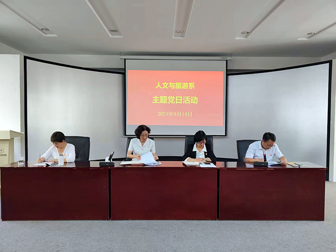 为提高全体党员教师的政治站位,统一思想认识,增强开展学习贯彻习近平新时代中国特色社会主义思想主题教育的责任感和使命感,9月14日下午,人文与旅游系党总支在和润楼报告厅集中进行主题党日活动。活动由党总支副书记陈玉香主持,系总支班子成员和全体党员教师参加。