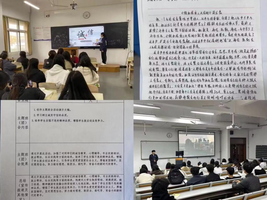 组织主题班团会。本次“诚信教育”主题班会以班级为单位开展,各班级围绕“诚信教育,国家助学贷款,诚信还款,校园贷”等内容,深入浅出,旁征博引,借助诚信故事、PPT、视频以及生活中存在的鲜活事例,向同学们详细讲解了高校学生资助政策等相关知识,引导学生秉持诚信准则,践行“诚以养德,信以立身”的精神,不断练就新时代青年的优秀品质。