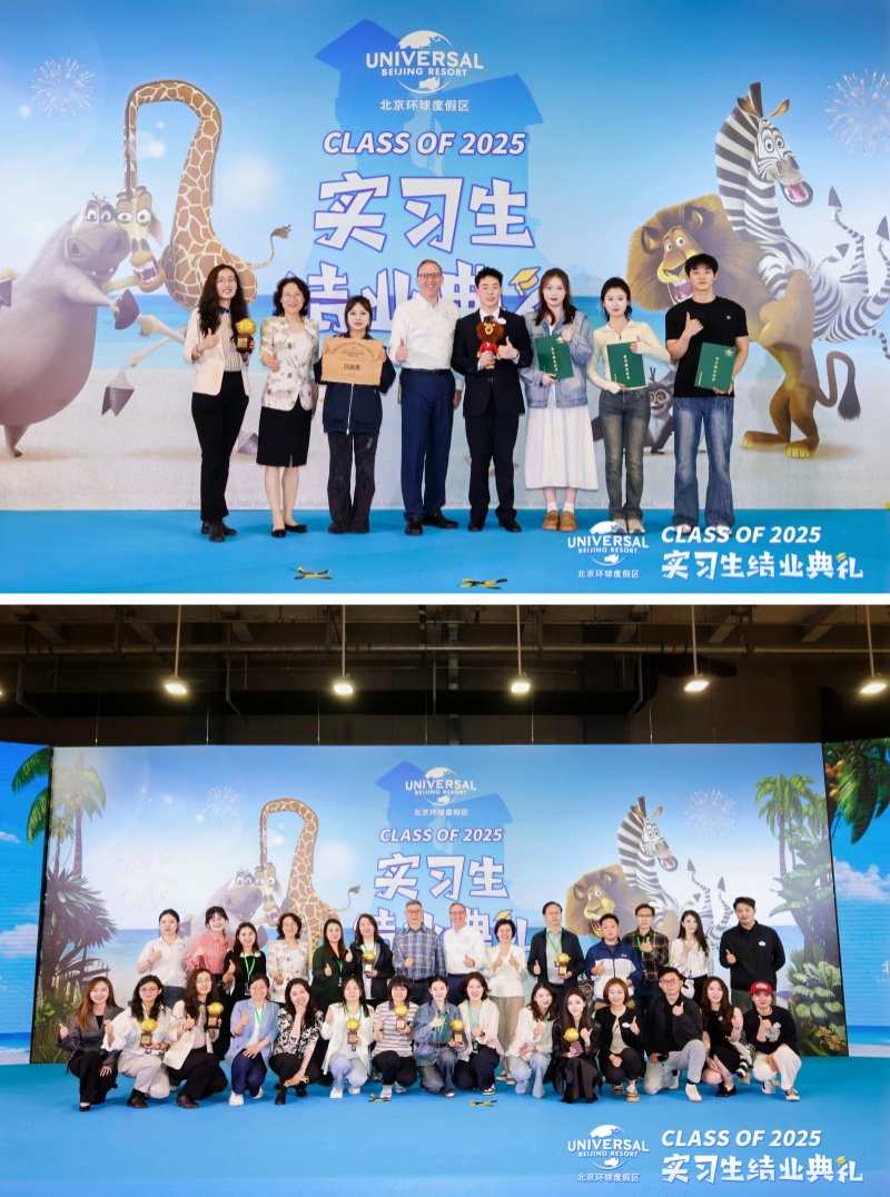 随后,调研组受邀参加北京环球度假区实习生结业典礼。典礼上,北京环球度假区执行副总裁兼总经理康兆宁授予我校“卓越贡献奖”,为优秀实习生颁发了荣誉证书,并特别表彰了学生在实习期间展现出的卓越服务意识和团队协作能力。