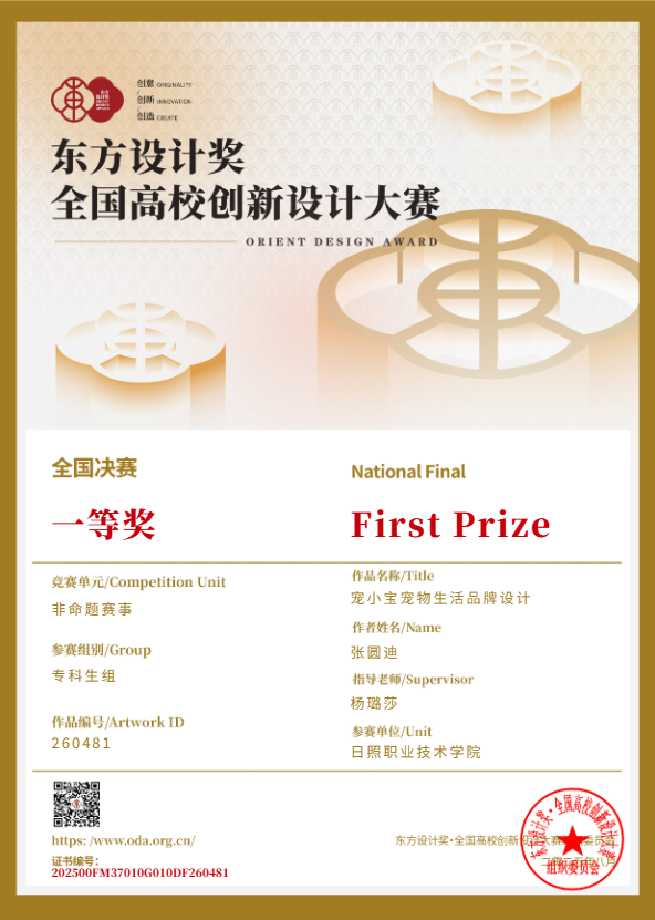近日,2025东方设计奖组委会传来捷报,我校创意设计系视觉传达设计专业张圆迪同学的作品《宠小宝宠物品牌设计》,在竞争激烈的专科生组非命题赛道中脱颖而出,一举斩获国家级一等奖。