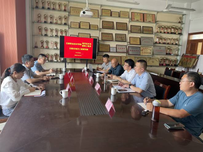 6月2日,日照市海洋工程研究院院长王忠勇、产业促进部总监闫波、科研助理陈菲菲一行三人来我校洽谈海洋腐蚀抗裂防渗剂产品的合作研发以及应用场景试验等方面的合作, 海洋技术系负责人黄贤刚、建筑工程系副主任杨志刚、海洋技术系副主任朱庆伟及食品检验检测技术专业相关教师参加了洽谈会,会议由黄贤刚同志主持。