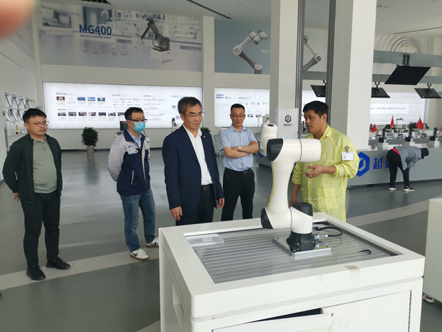 在日照市越疆智能科技有限公司,厉建刚一行在公司人资行政部部长仇绍安、生产部部长杜云寒、质量部部长李叶鹏的陪同下,参观了企业展厅、测试车间和总装车间。在座谈中,仇绍安首先介绍了企业的发展历程、主要产品和生产经营状况,接着详细介绍了企业校企合作规划和近期人才需求情况。厉建刚介绍了此次“访企拓岗”企业走访的目的,希望校企双方实现在实训基地、人才资源等方面的共建共享,采用多渠道、多层次的合作方式,提高人才培养质量,满足企业用人需求。最后双方就人才联合培养、技术研发、科研合作、职业技能竞赛等事宜进行了探讨。