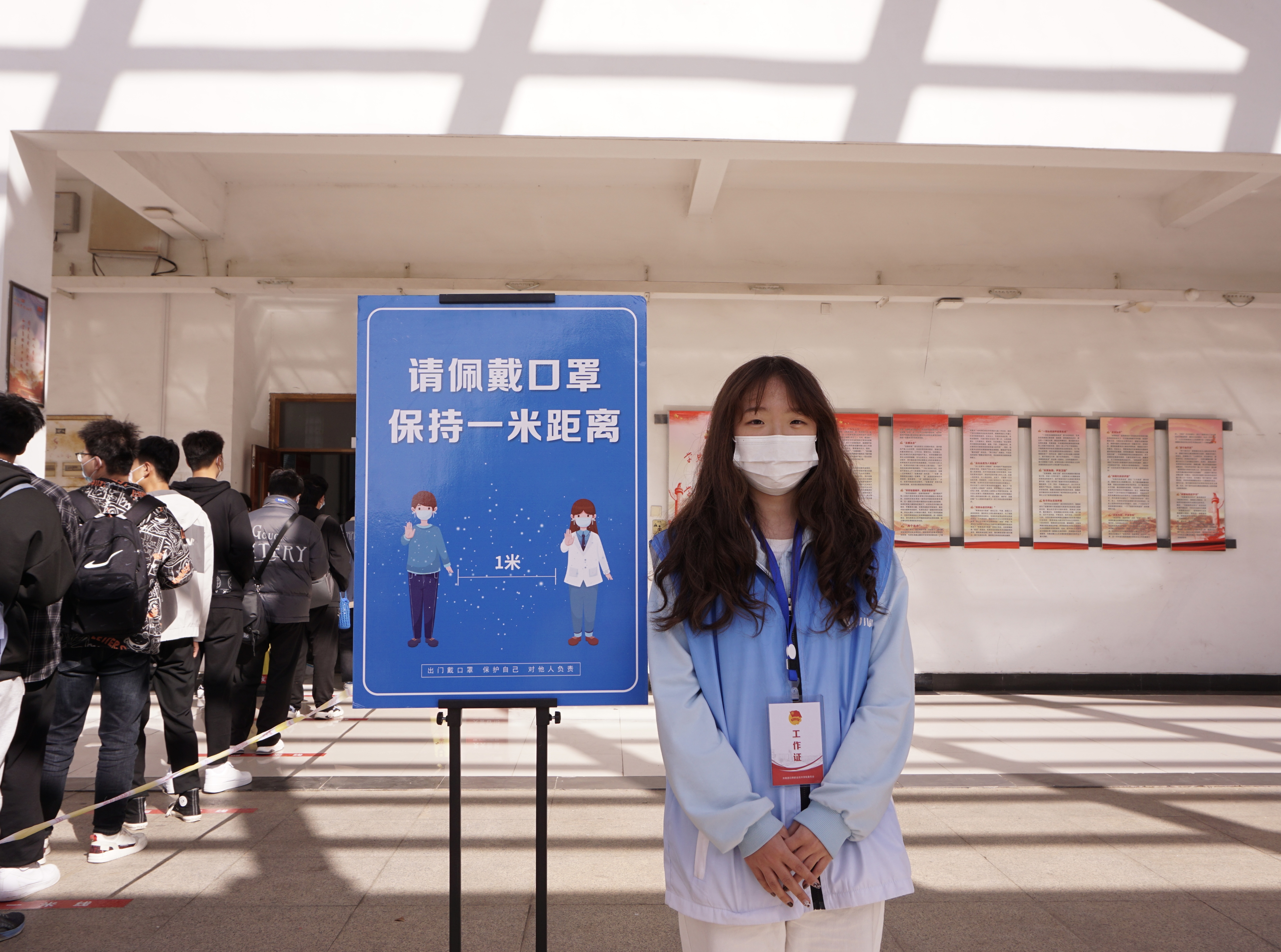 上午12点核酸检测结束,在门口负责引导工作的2020级会计专业学生毕铧予,规范的脱下了防护服,衣服已经被汗水打湿。“上午到现在几乎一刻没停,全身防护服,热得有点透不过气。这次作为志愿者亲身经历,才真切感受到一线医务工作者的不易,做志愿者,我可以的。”