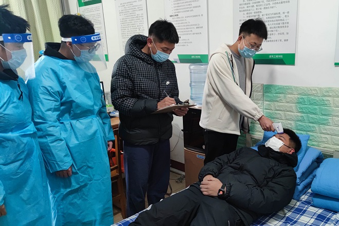 此次演练的主要内容为“园区门口体温检测”和“学生在公寓自测发烧”两个突发情况场景的应急处置。场景中模拟了学生发现身体出现异常时的应急处置程序,实战演练学生上报信息、班主任与辅导员赶赴现场应急处置、寻求校医帮助、逐级上报、引导学生配合隔离观察等环节,切实让学生熟知掌握应急处置过程。在疫情防控演练中,着重强调演练的有序性、严肃性、真实性,达到“以演促练、以练促战”效果,确保出现疫情能够第一时间响应和处置。演练结束后,针对过程中出现的问题,进一步完善演练预案,确保不出现问题。