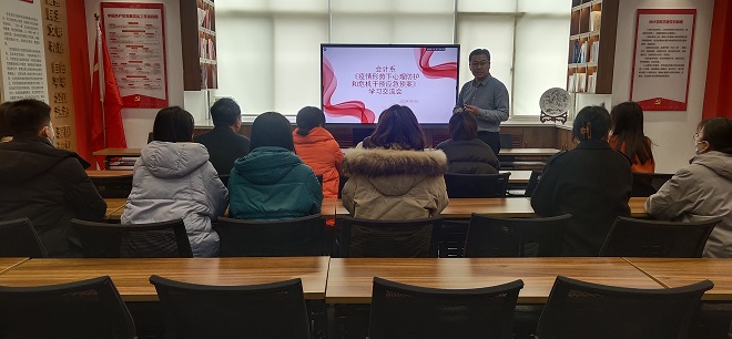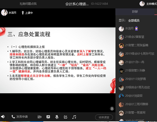 为做好疫情形势下学生的心理防护和心理危机干预工作,及早预防、及时疏导、有效干预、快速控制可能出现的学生心理危机事件,按照省、市和我校疫情防控相关政策,结合我校实际,会计系采取线下与线下相结合的方式,组织相关人员学习和交流了《疫情形势下心理防护和危机干预应急预案》。
