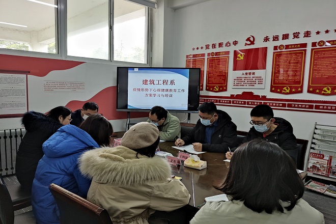 本次会议共分为两部分,第一部分是全体成员对《日照职业技术学院疫情形势下心理健康教育工作方案》进行研讨学习;第二部分是由心理辅导员丁文杰对疫情防控形势下心理健康教育工作做出培训。集体认真深入学习方案以后,丁文杰以《建筑工程系疫情防控形势下心理健康教育工作方案》为根据,详细梳理了防控阶段、疫情阶段和疫后阶段所需开展的工作。随后,她分类列举了目前阶段学生可能发生的疫情应激心理以及简单处理应激状况的措施。与会人员认真聆听,针对疫情防控状态下的心理健康教育工作展开了有效讨论。