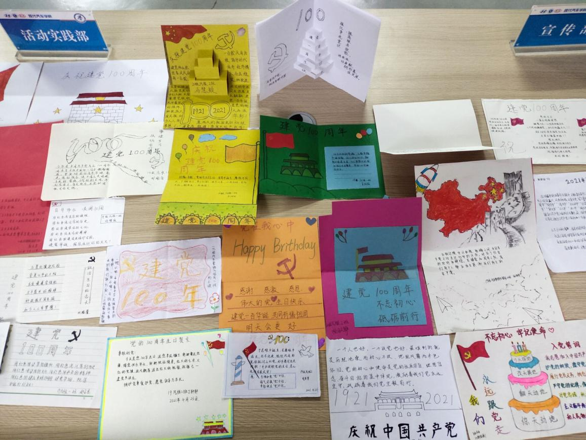世纪回眸说译事,百年巨变话沧桑。在建党百年之际,同学们积极参加到写贺卡的活动中,为党的100周年生日送出自己的祝福,他们或用手中的彩笔绘制出对党的拥护,或用手中的钢笔书写下对党的祝福,或用一双巧手叠出对党满满的热爱。一张张贺卡,表达着青年一代的一份心意,一句句祝福,表达同学们对党的敬爱。