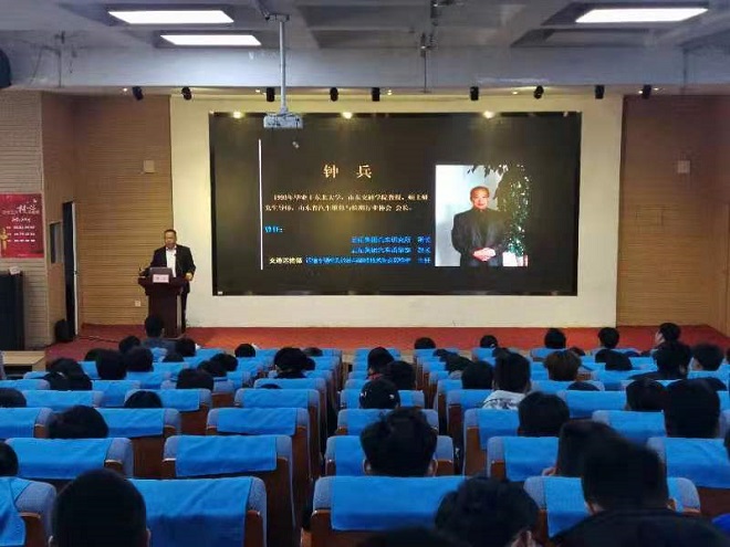 钟兵的讲座贴近学生思想、情感、实际,讲解轻松、幽默又富含哲理,赢得学生阵阵掌声。讲座从命运、认识山东、个人能力与素质、社会需求、职业层级与类别、职业规划、专升本升学深造等七个部分展开,他首先用古代先贤关于“命”、“运”的相互关系点明本次讲座的主题“大学生职业规划”。他通过分析当今大学生的在校学习情况、山东省各高校的就业深造情况、经济发展程度和地域分布对就业的影响,指明当前严峻的就业形势。通过对比近年来世界五百强、全国五百强、央企和各大中小企业的用人标准,以及时代发展对现在年轻人提出的新要求,引导同学们深入思考“什么是真正的大学生”、如何规划自己的职业生涯、未来求职道路上需要具备什么样的技能等方面的问题,如何提升适应社会和融入社会的能力。他指出,未来的职场中,高学历、高素养、高品格、高能力的毕业生,往往能在求职过程中脱颖而出,这是社会和时代对当代大学生的共同要求,它在一定程度上决定了个人未来的长期发展。他谈到,十年前你是谁,一年前你是谁,甚至昨天你是谁,都不重要,重要的是:今天有目标的抉择和今后努力的方向,会决定明天的你将成为谁。