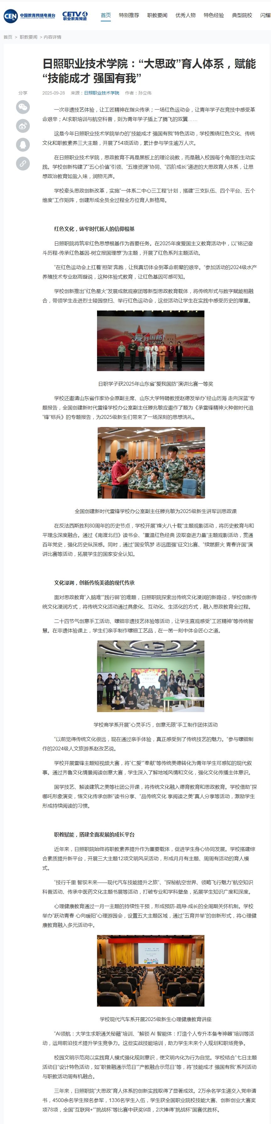 中国教育网络电视台报道:日照职业技术学院:“大思政”育人体系,赋能“技能成才 强国有我”