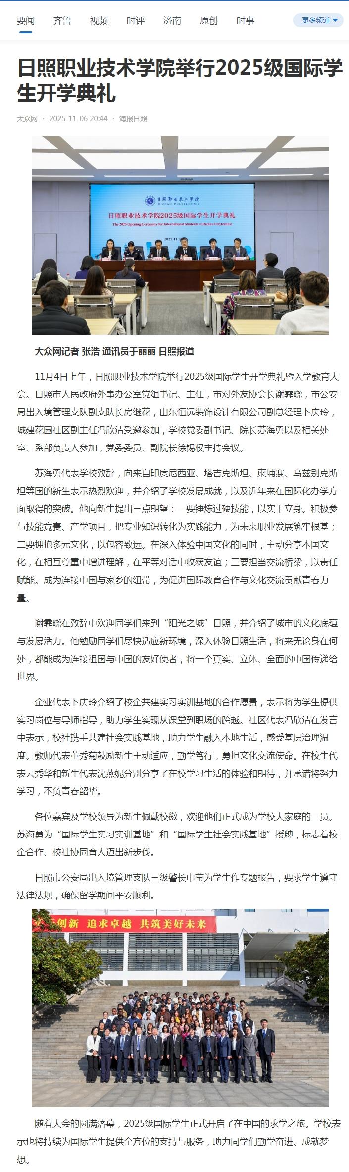 海报新闻客户端报道:日照职业技术学院举行2025级国际学生开学典礼