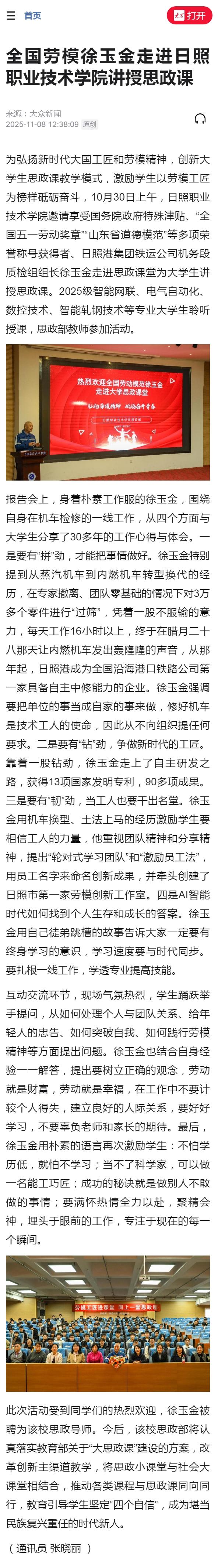 大众新闻客户端报道:全国劳模徐玉金走进日照职业技术学院讲授思政课