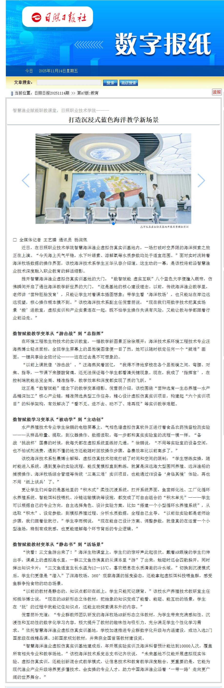 日照日报报道:智慧渔业赋能职教课堂,日照职业技术学院———打造沉浸式蓝色海洋教学新场景