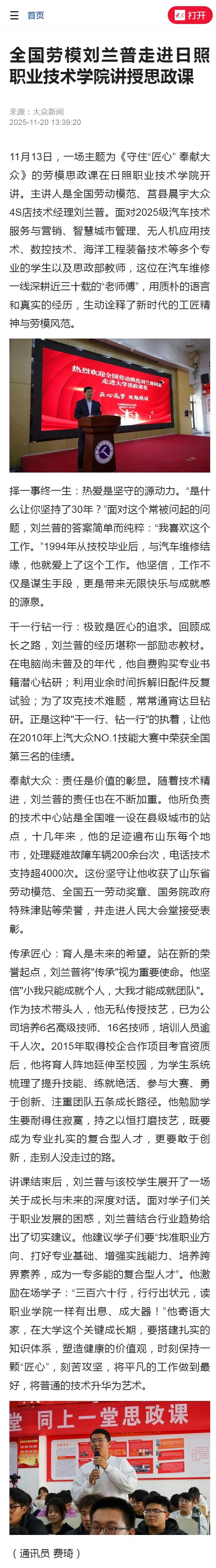 大众新闻客户端报道:全国劳模刘兰普走进日照职业技术学院讲授思政课