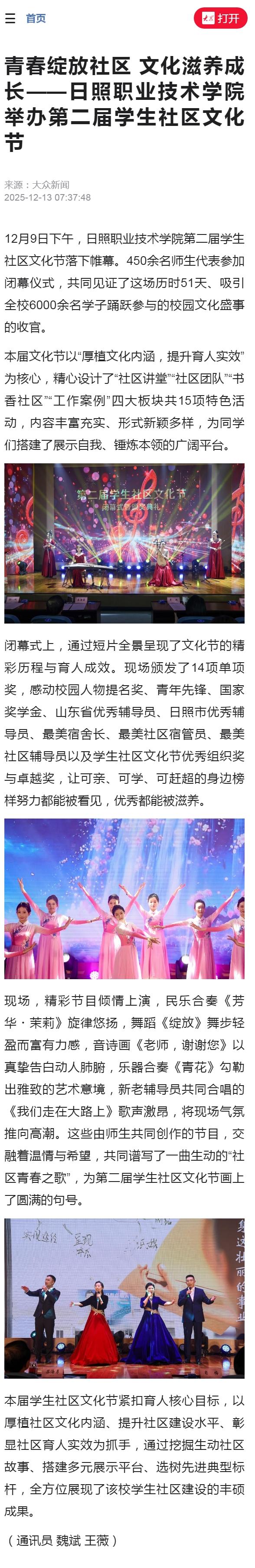 大众新闻客户端报道:青春绽放社区 文化滋养成长——日照职业技术学院举办第二届学生社区文化节