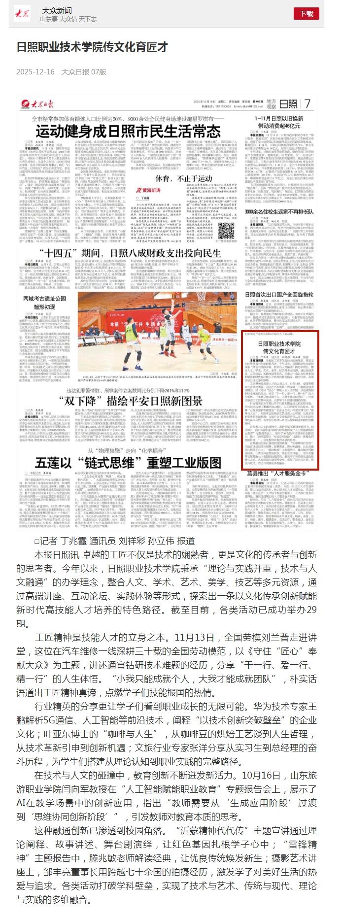 大众日报报道:日照职业技术学院传文化育匠才