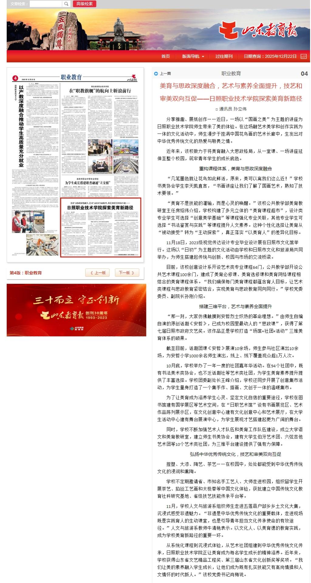 山东教育报报道:美育与思政深度融合,艺术与素养全面提升,技艺和审美双向互促——日照职业技术学院探索美育新路径