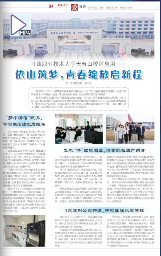 日照日报黄海晨刊报道:日照职业技术大学天台山校区启用——依山筑梦,青春绽放启新程