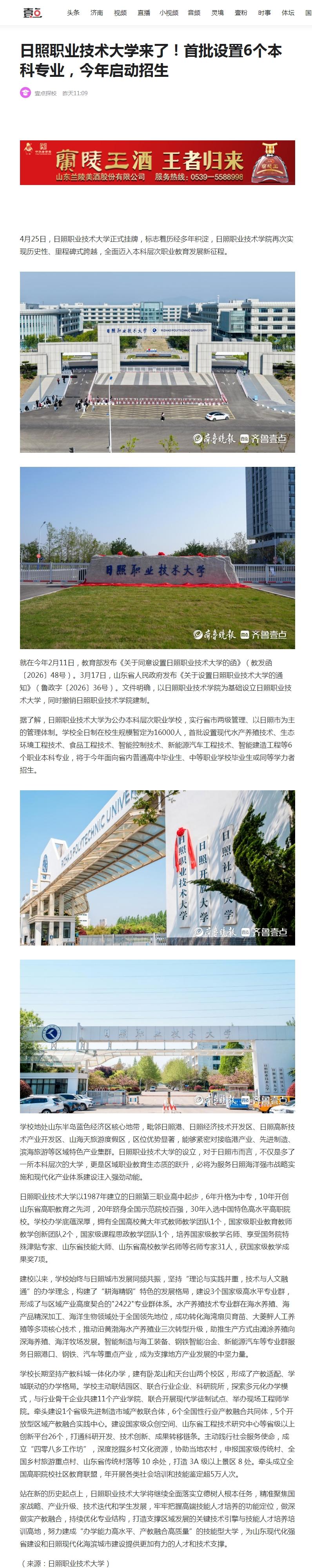 齐鲁壹点报道:日照职业技术大学来了!首批设置6个本科专业,今年启动招生
